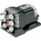 GARDENA's automatiske vandfordeler sørger i kombination med en GARDENA-vandingscomputer C 1060 (produkt-nr. 1864, 1866) for, at der vandes på op til seks forskellige steder i din have, lige efter hinanden. Vand eksempelvis en række planter på græsplænen med en vander og vand potteplanter, bede, hække og blomsterkasser med et drypvandingssystem. I henhold til programmerne på vandingscomputeren åbnes vandudgangene automatisk en ad gangen. Praktisk: Vandfordeleren tilpasser sig efter forholdene i din have på fleksibel vis. Det vil sige, at du kan nøjes med at vande to steder eller helt op til seks steder, hvis det behøves. De overflødige vandudgange lukkes blot ved hjælp af en indstillingsarm. Fordi de forskellige planter i din have har brug for forskellige mængder vand, kan vandingsvarigheden også indstilles individuelt via programmering på vandingscomputeren. Vandfordeleren bringer den ønskede mængde vand lige derhen, hvor den skal. Denne intelligente løsning er også ideel, hvis det eksisterende vandtryk ikke gør det muligt at vande det hele på én gang. Montér simpelthen blot vandfordeleren på husmuren eller på jorden. Den anbringes på en fastgørelsesplade og kan til enhver tid tages af. Fordi alle seks vandudgange er placeret i én retning, er apparatet særdeles pladsbesparende. Enheden er udstyret med 26,5 mm (G 3/4) -tilslutningsgevind og leveres fuldt udstyret med fem hanestykker (produkt-nr. 901) og tre endekapper.