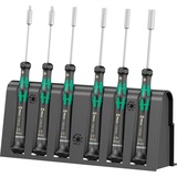 Wera 2069/6 elektroniktekniker skruetrækker udskiftning Kraftform Micro + Rack med Black Point spids består af seks skruetrækkere til sekskantede sokkelskruer. Wera Black Point-spidsen og den komplekse hærdningsproces giver holdbarhed, nøjagtighed af pasform og optimeret korrosionsbeskyttelse. Multikomponentskruetrækkerhåndtaget muliggør ergonomisk korrekt arbejde. Takket være den drejelige hætte og den hurtigsvingende zone under denne hætte er lynhurtig snurren mulig. Tidskrævende greb som med konventionelle drejebænke med fine øjne er ikke længere nødvendigt uden udskiftning. Præcisionszonen direkte over bladet giver brugeren en god fornemmelse for den rigtige rotationsvinkel under justeringsarbejdet. Håndtagsmærket "Tag det roligt" med farvekodning i henhold til profiler gør det også lettere at finde i værktøjstasken og på arbejdspladsen. Skruetrækkersættet leveres med rack, der kan fastgøres til væggen. Dette sikrer korrekt opbevaring og hurtig adgang.